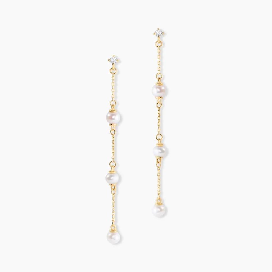 Boucles D’oreilles Pendantes Chaine Or Jaune 375/1000 3 Perles De Culture Nacre Blanche Accompagne Oxyde