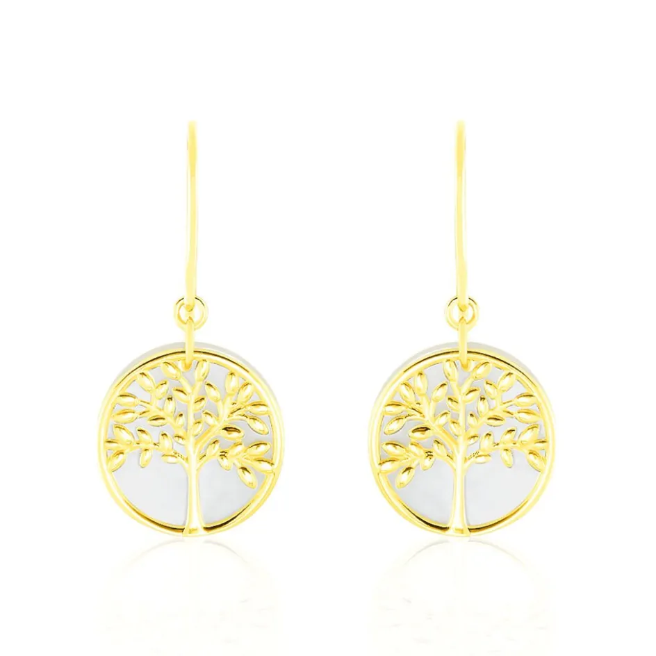 Boucles D’oreilles Or Jaune 375/1000 Fond Nacre Motif Arbre De Vie