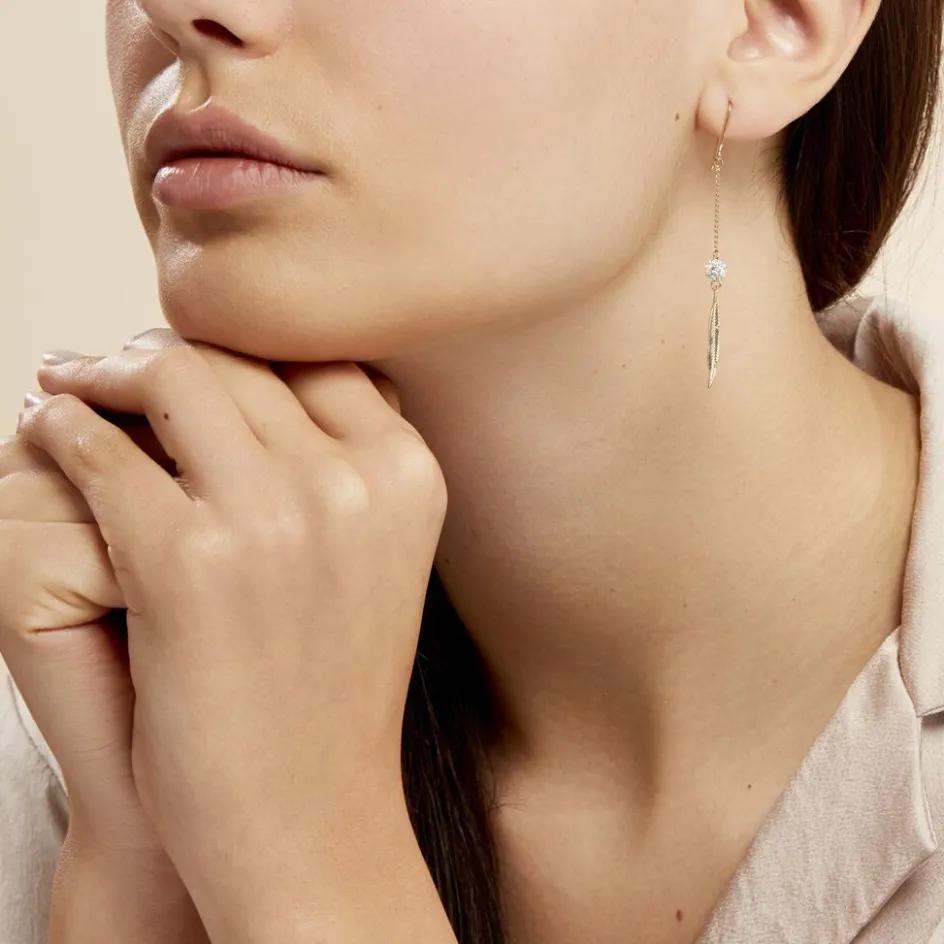 Boucles D’oreilles Pendantes Or Jaune 375/1000 »powoo » Plume Strass Blanc