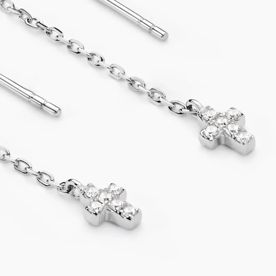 Boucles D’oreilles Argent Blanc 925/1000 Croix Oxydes De Zirconium Micro Serti Double Pendante Chaîne Forçat 4cm