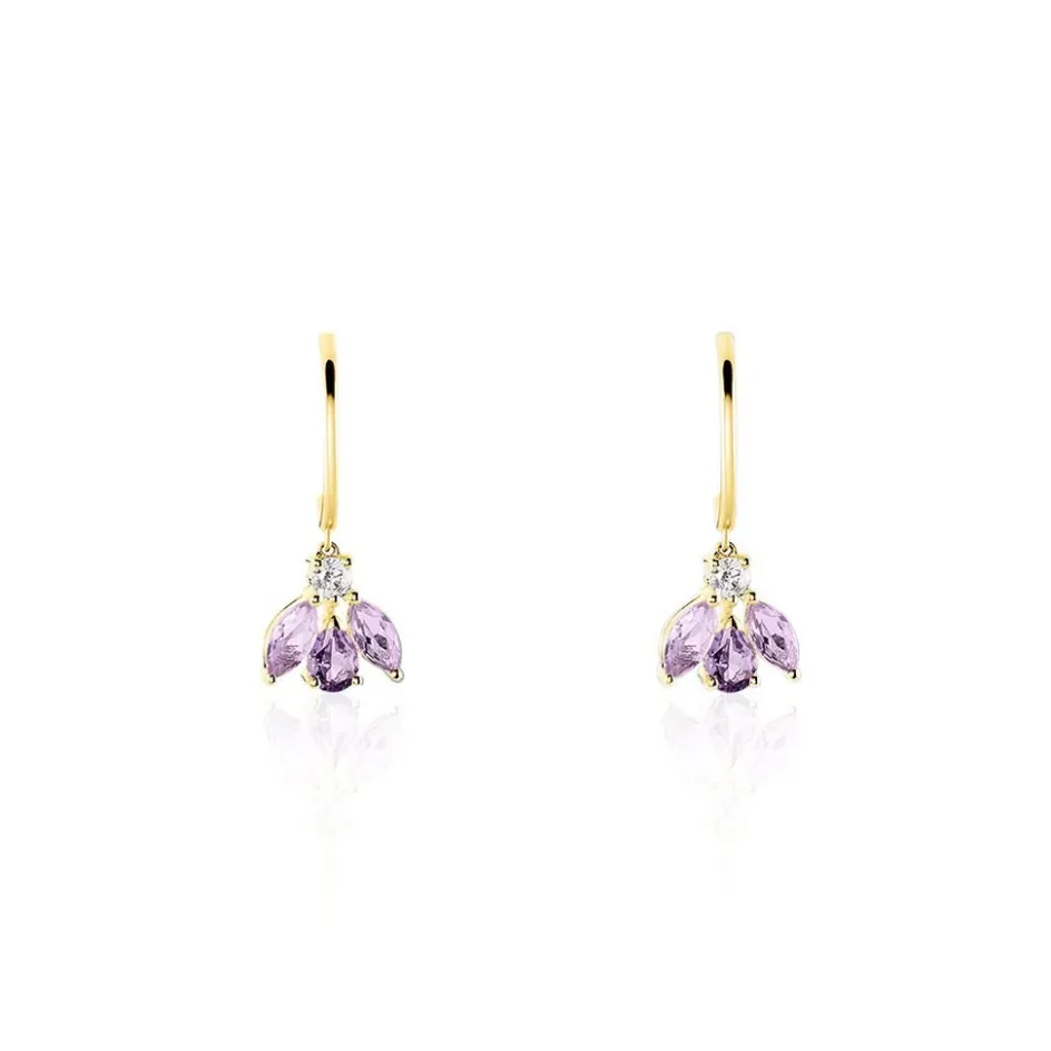 Boucles D’oreilles Pendantes Or Jaune 375/1000 Motif Pétale Améthyste Serti Griffes