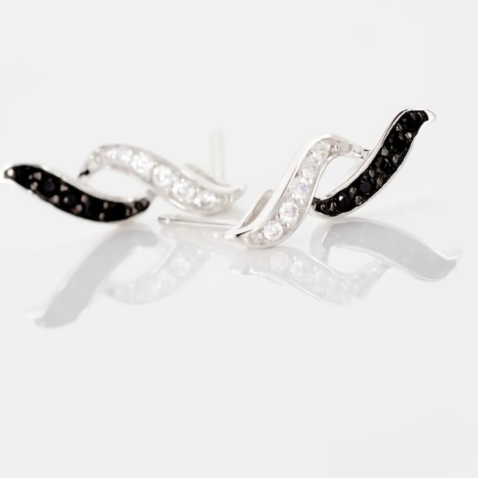 Boucles D’oreilles Argent Blanc 925/1000 Vagues Oxydes De Zirconium Noirs Et Blancs