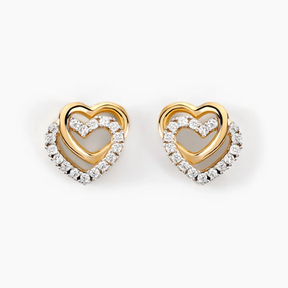 Boucles D’oreilles Puces Or Jaune 375/1000 Double C艙ur Avec C艙ur Pave Oxydes De Zirconium