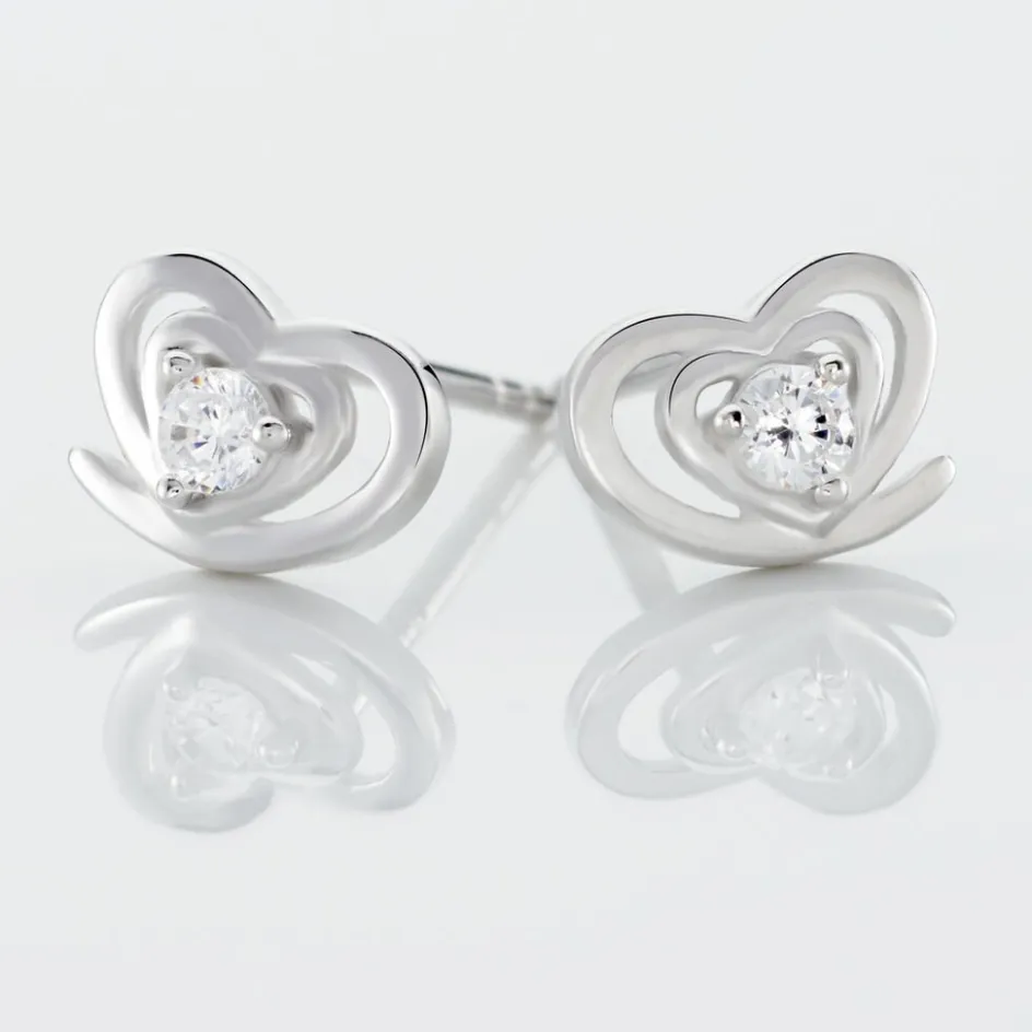 Boucles D’oreilles Puces Argent Blanc 925/1000 Coeurs Avec Oxyde De Zirconium