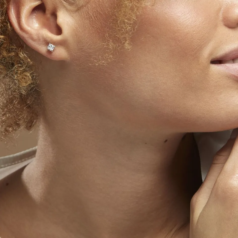 Boucles D’oreilles Puces Argent Blanc 925/1000 Oxyde De Zirconium Carré Serti 4 Griffes 4mm