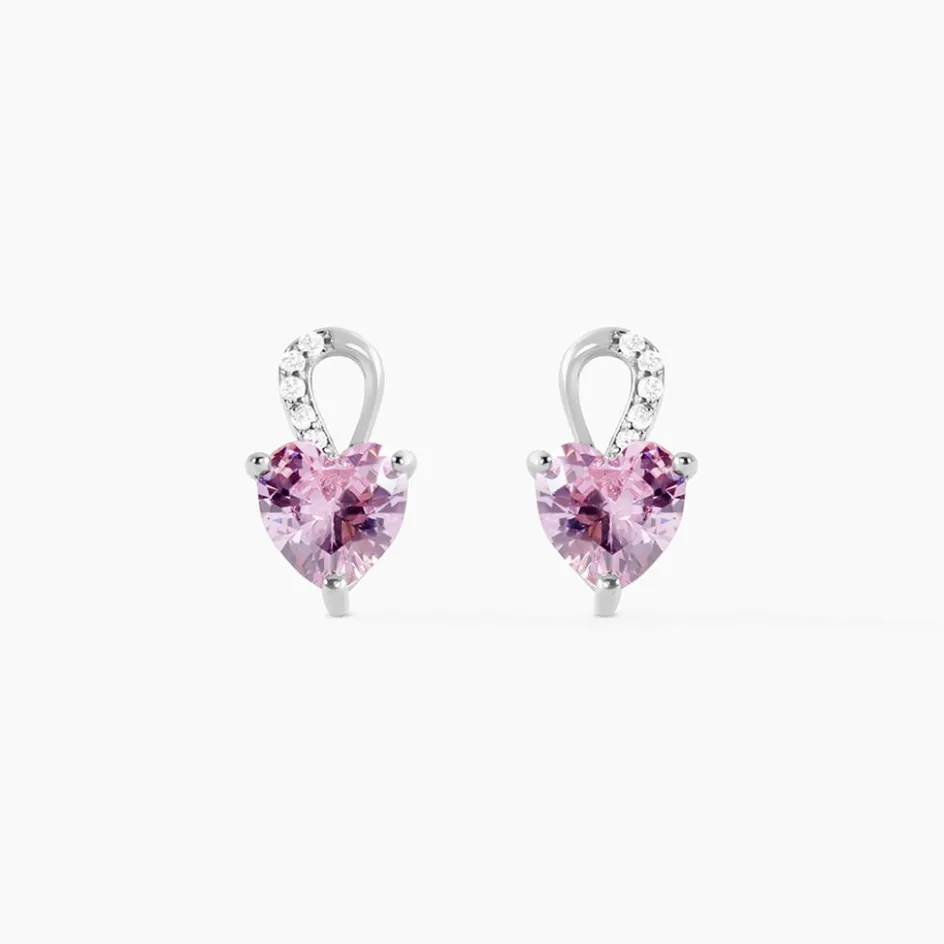 Boucles D’oreilles Puces Argent Blanc 925/1000 Coeur Rose Serti Griffes Accompagne Oxydes De Zirconium