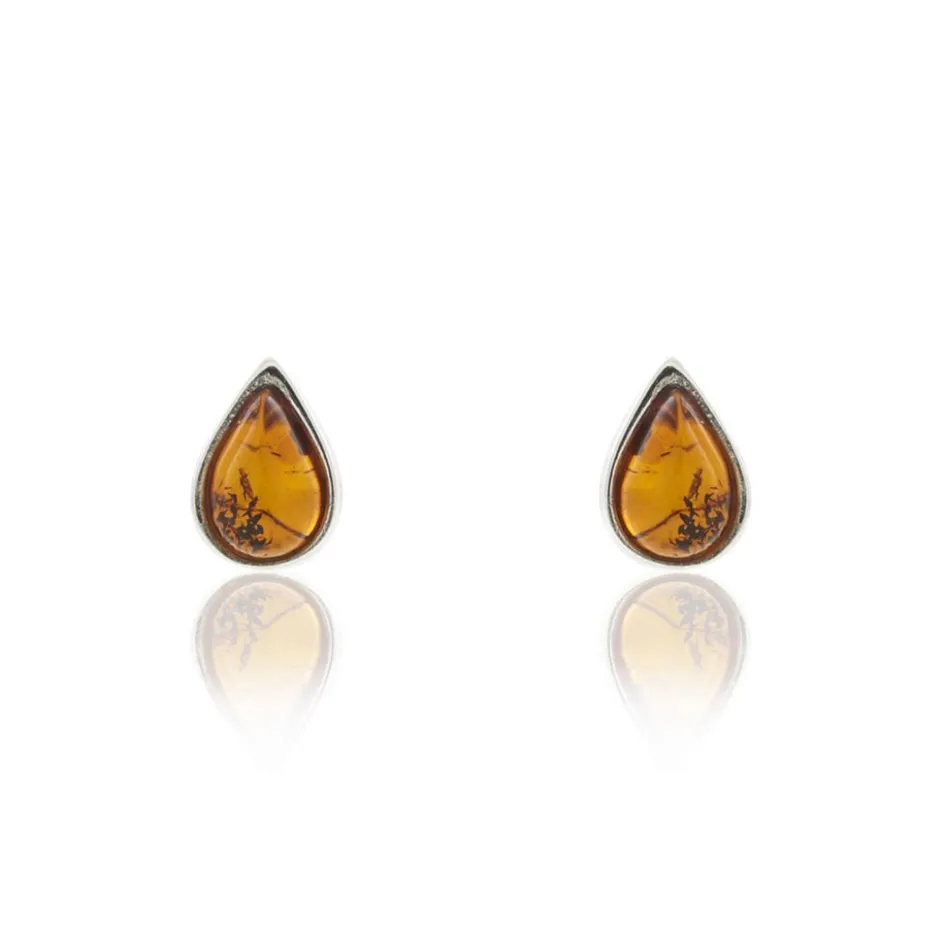 Boucles D’oreilles Puces Argent Blanc 925/1000 Formes Gouttes Ambre Entourees D’argent