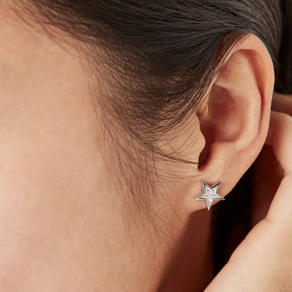 Boucles D’oreilles Puces Argent Blanc 925/1000 Etoiles Pavage Oxydes De Zirconium
