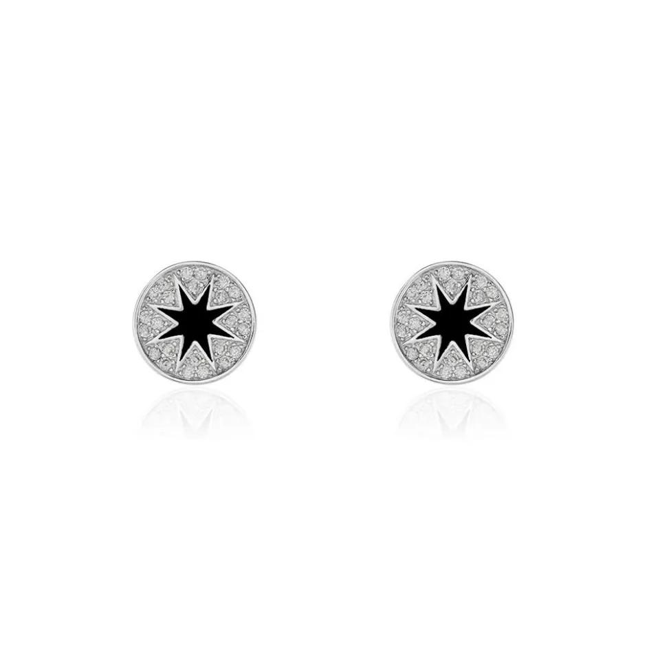Boucles D’oreilles Puces Argent Blanc 925/1000 Pastilles Etoile Laque Noire Pavage Oxydes De Zirconium