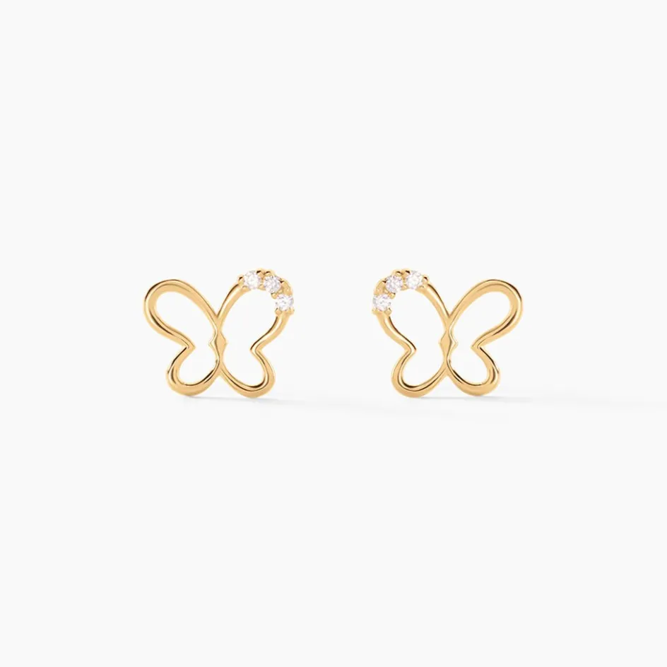 Boucles D’oreilles Or Jaune 375/1000 Puces Papillons Oxyde De Zirconium