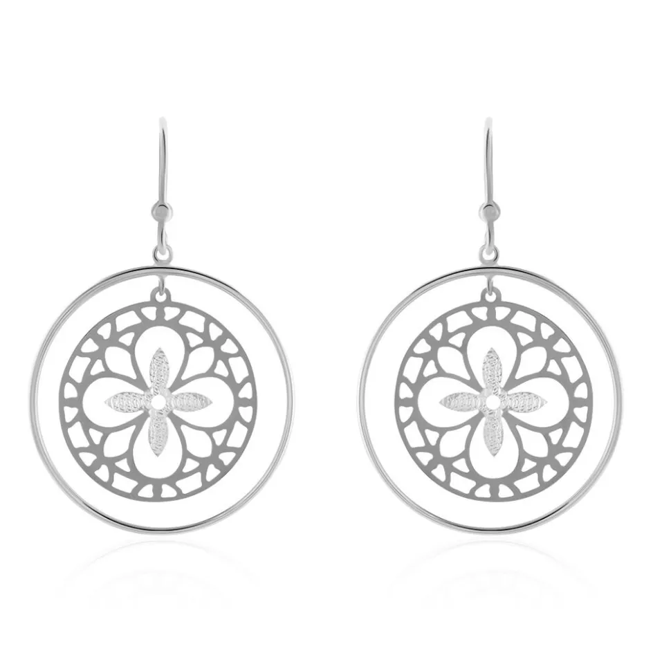 Boucles D’oreilles Pendantes Or Blanc 375/1000 Double Cercles Avec Motif Trefles Ajoures