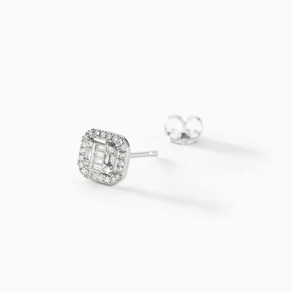 Boucles D’oreilles Puces Or Blanc 375/1000 Formes Carrées Diamants Baguettes 0.18cts