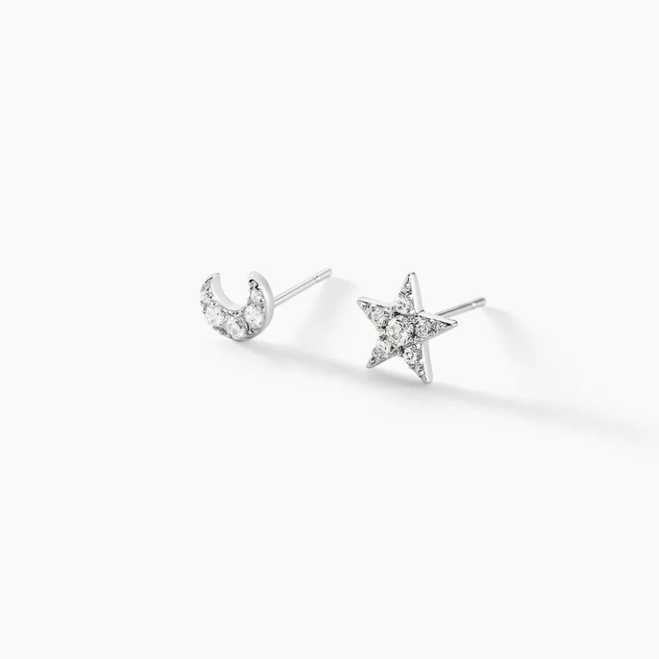 Boucles D’oreilles Or Blanc 375/1000 Puces Motifs Etoile Et Lune Pavages Oxydes De Zirconium