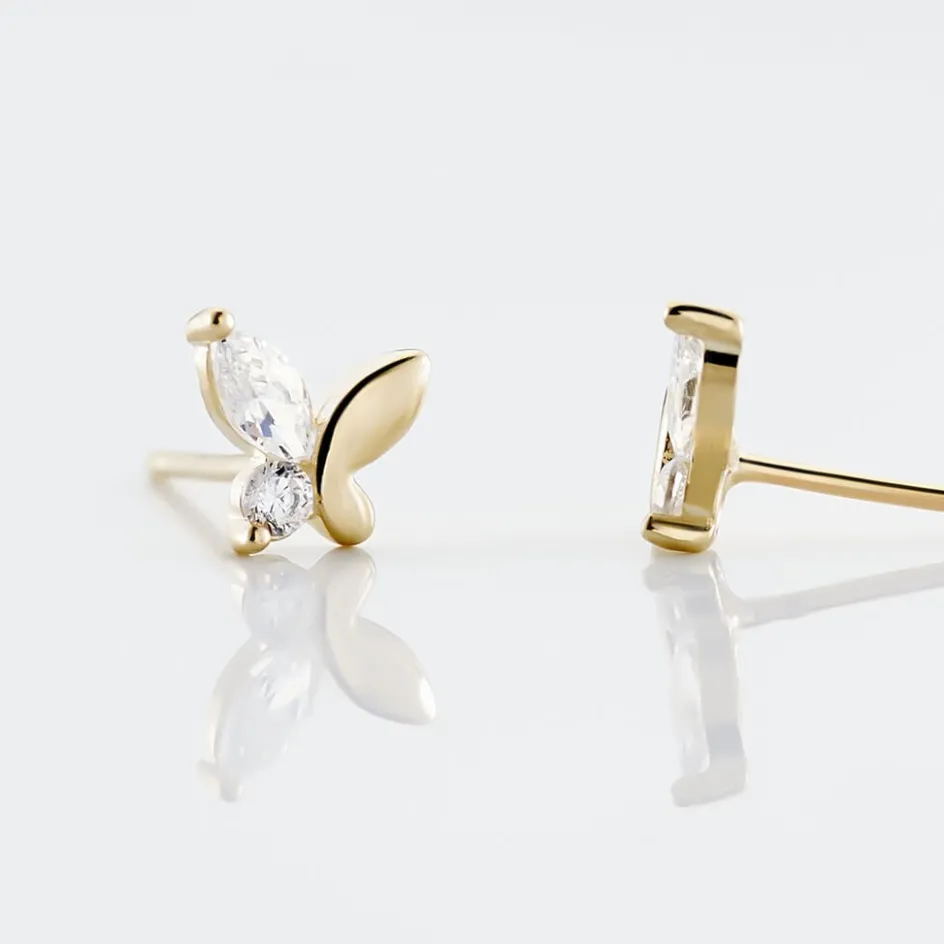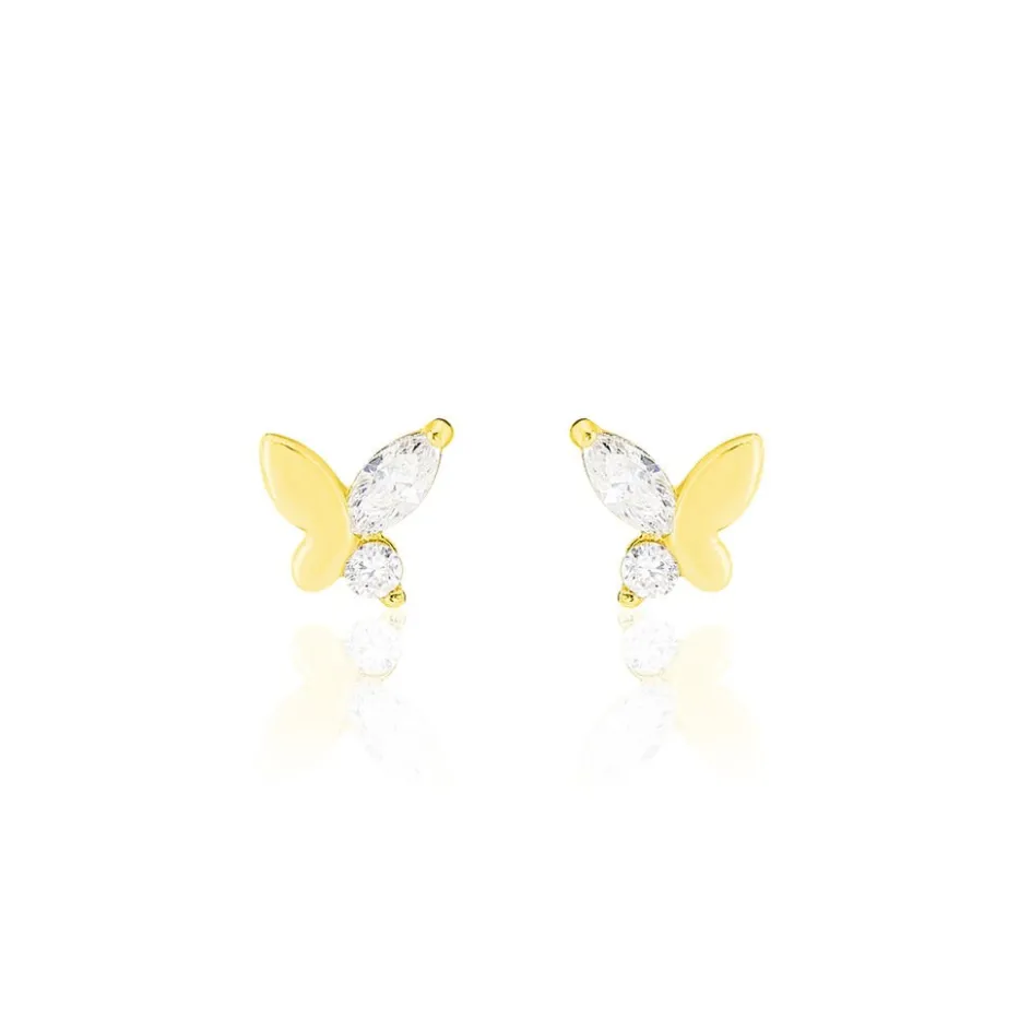 Boucles D’oreilles Or Jaune 375/1000 Puces Formes Papillons + Oxydes De Zirconium