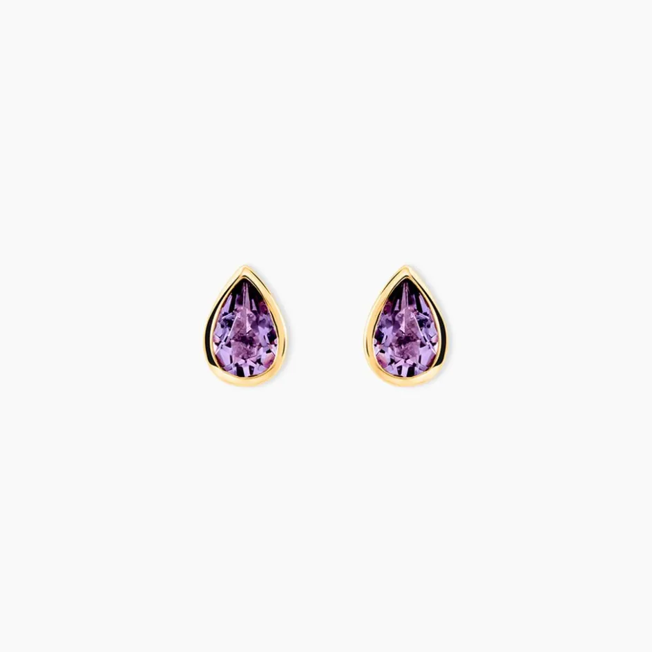 Boucles D’oreilles Puces Or Jaune 375/1000 Améthystes Serties Clos Formes Poires