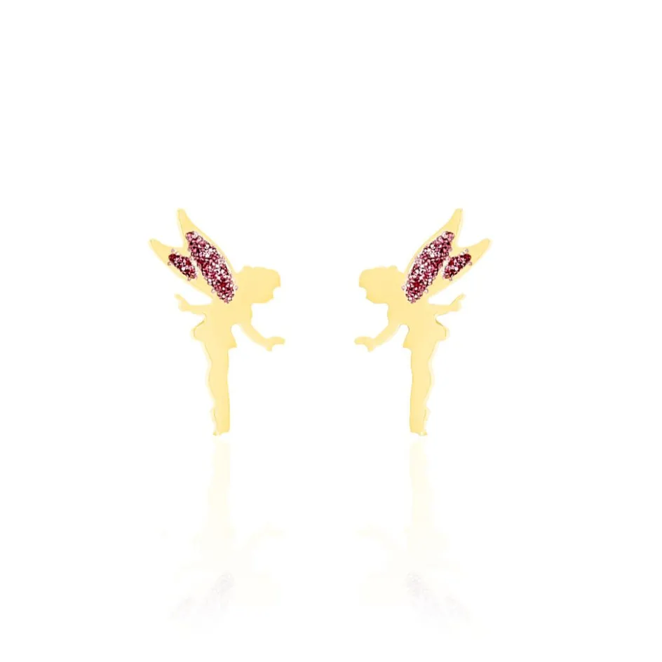 Boucles D’oreilles Or Jaune 375/1000 Puces Motifs Fées Glitter Rose