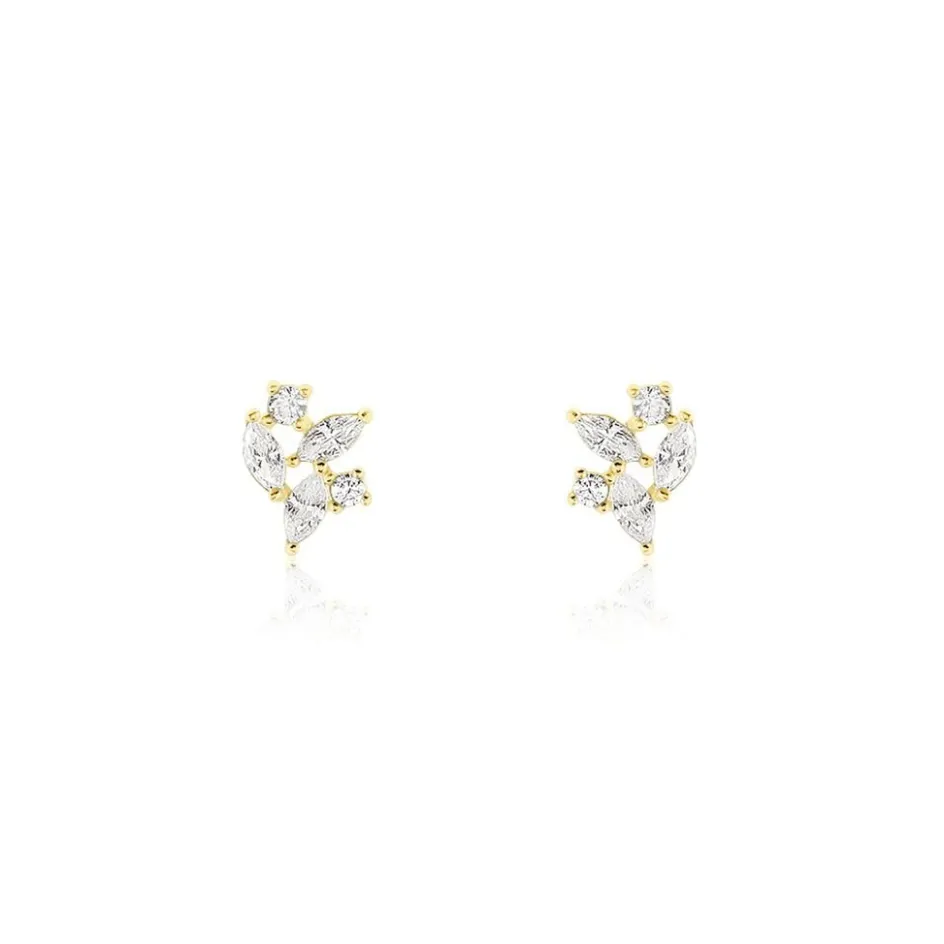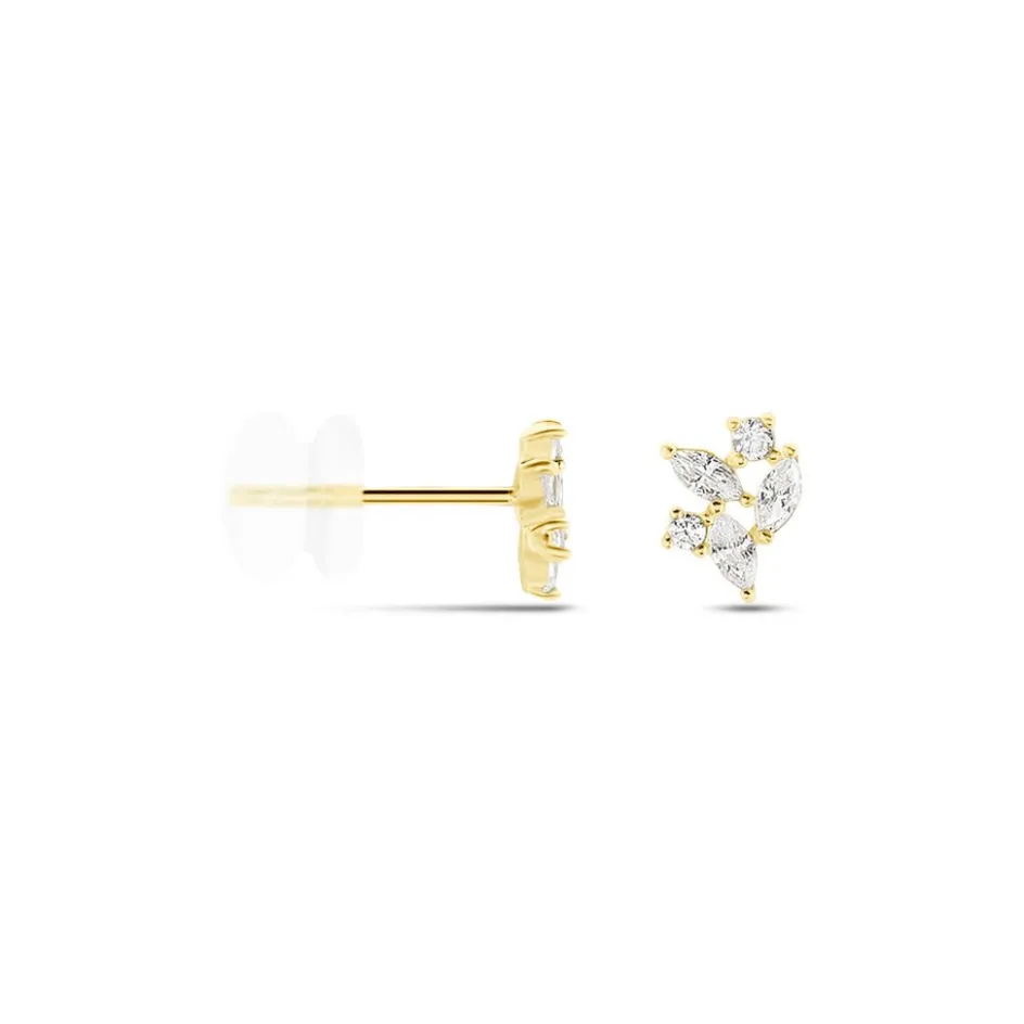 Boucles D’oreilles Puces Or Jaune 375/1000 Fleur Oxydes De Zirconium Rondes Et Navettes Sertis Griffes