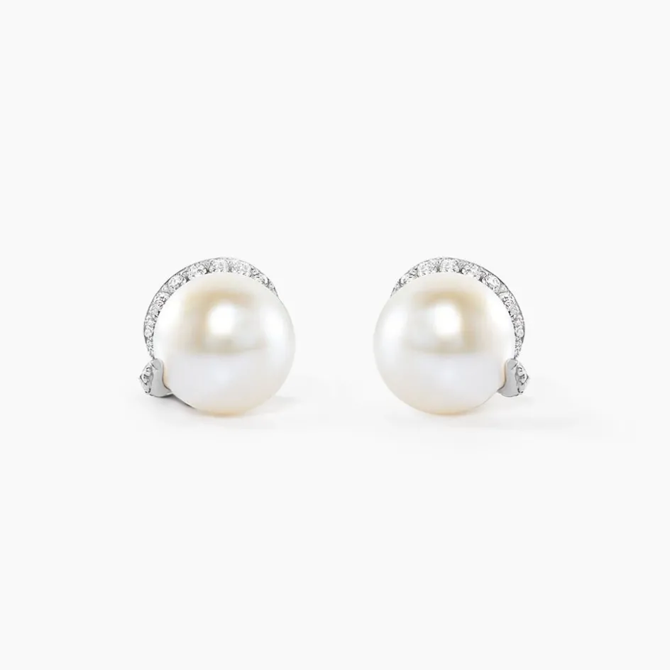 Boucles D’oreilles Or Blanc 375/1000 Puces Perles De Culture 7mm Spirale Oxydes De Zirconium