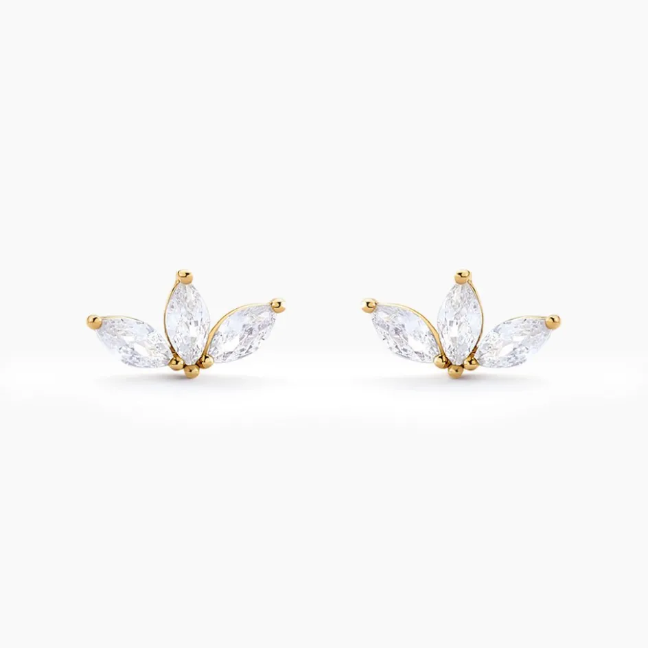 Boucles D’oreilles Puces Or Jaune 375/1000 Fleur Oxyde De Zirconium Navettes Serti Griffes