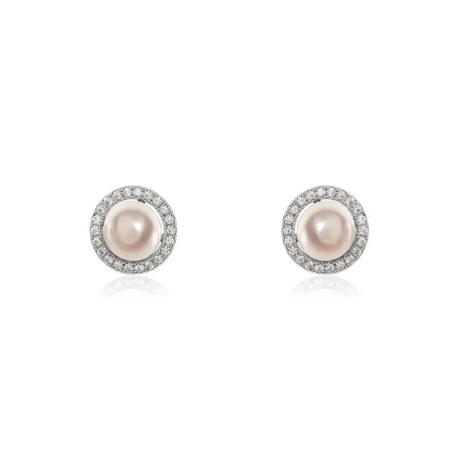 Boucles D’oreilles Puces Argent Blanc 925/1000 Perles De Culture 6mm Entourage Oxydes De Zirconium