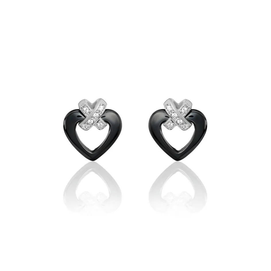 Boucles D’oreilles Argent Blanc 925/1000 Ceramiques Noires Forme Coeurs Croix Pavees Oxydes De Zirconium
