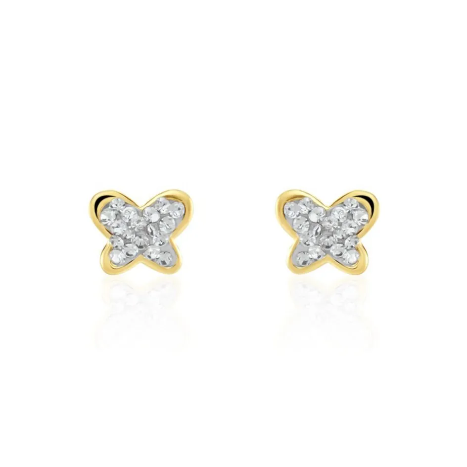 Boucles D’oreilles Puces Or Jaune 750/1000 Papillons Strass Fermoirs Vis