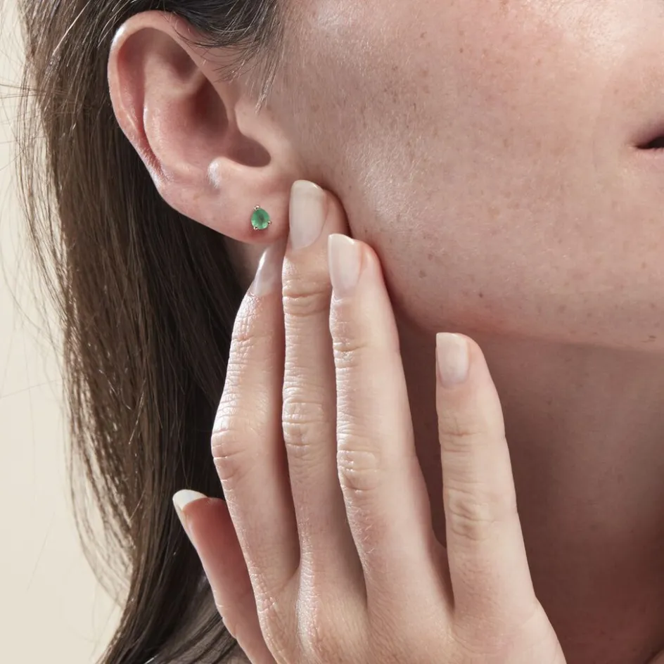 Boucles D’oreilles Puces Or Jaune 375/1000 Emeraude Poire Serti Griffes 0.6ct