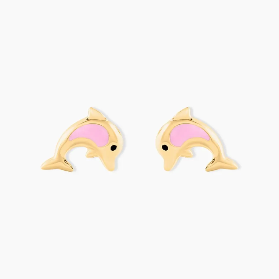 Boucles D’oreilles Puces Or Jaune 750/1000 Dauphins Smalto Rose Fermoirs Vis