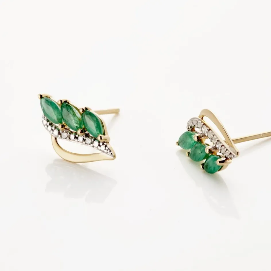 Boucles D’oreilles Puces Or Jaune 375/1000 Trilogie Emeraudes Navette Accompagnées Diamants