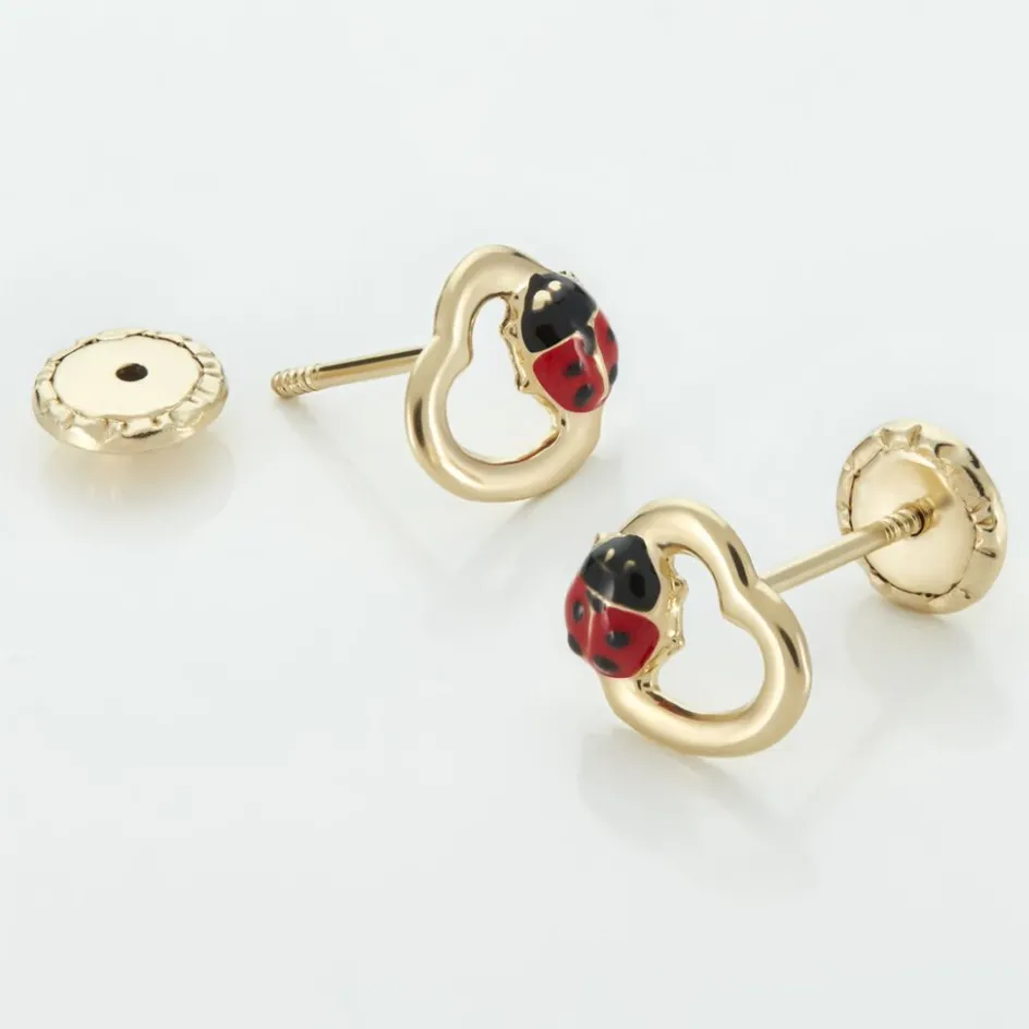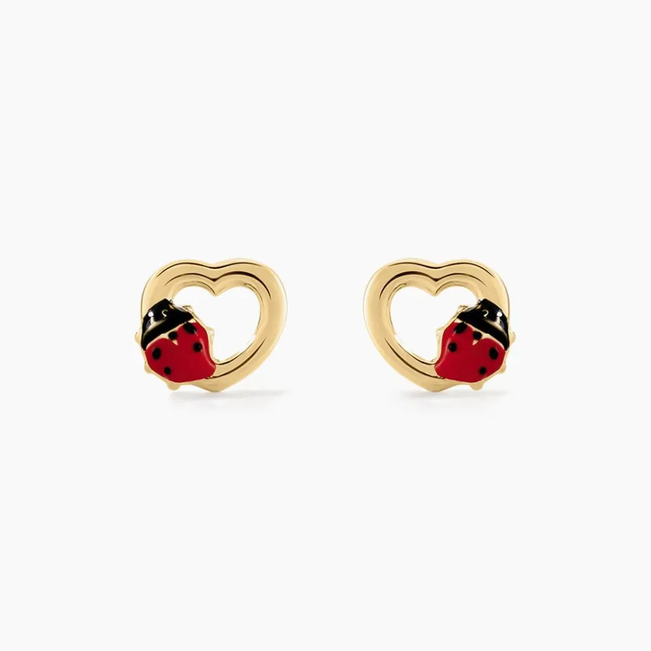 Boucles D’oreilles Puces Or Jaune 750/1000 Coeurs Et Coccinelles Smalto Rouge Fermoirs Vis