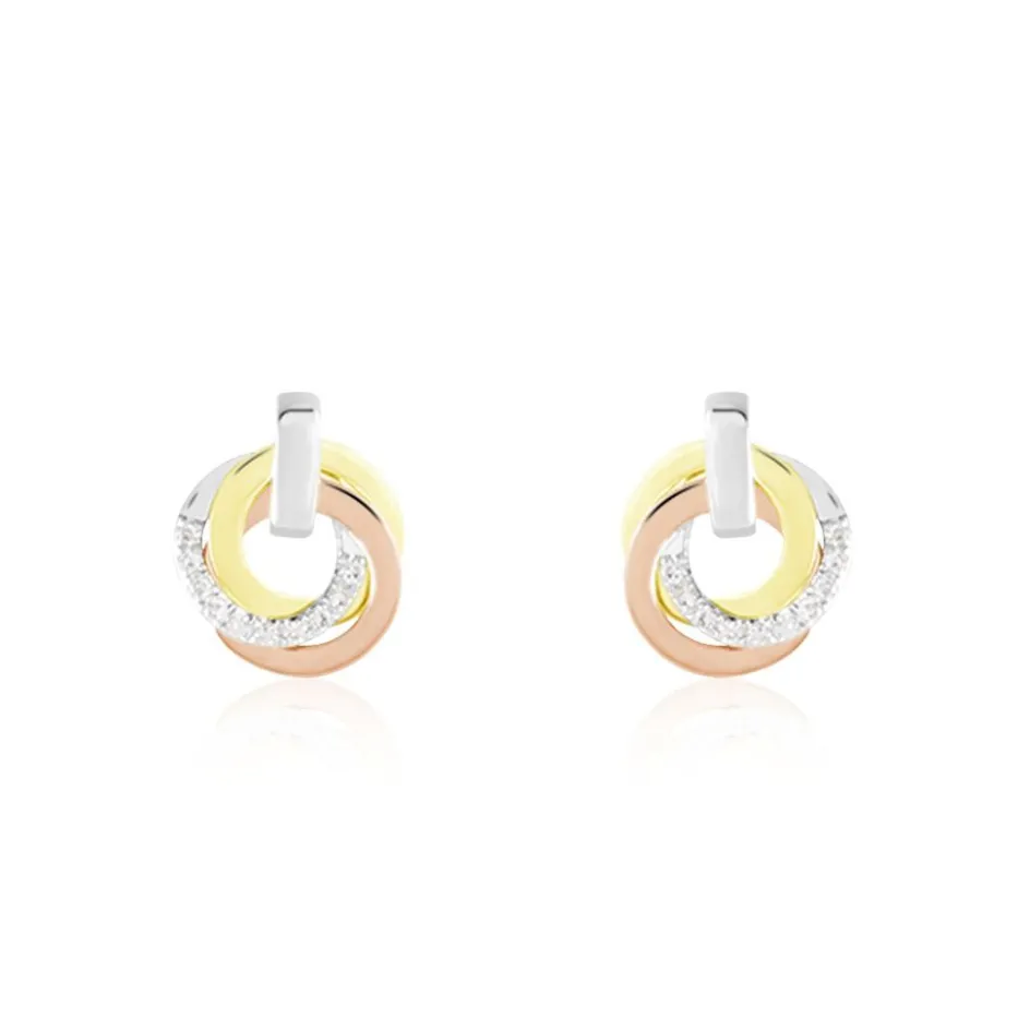 Boucles D’oreilles Puces Or Tricolore 375/1000 Forme Cercles Entrelaces Pavage Diamants
