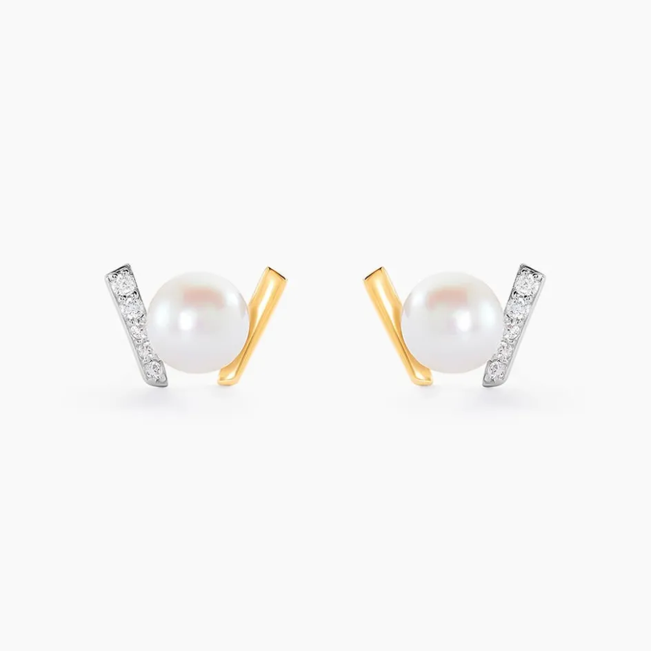 Boucles D’oreilles Puces Or Jaune 375/1000 Perle De Culture Blanche Et Barre Pavage Oxydes De Zirconium