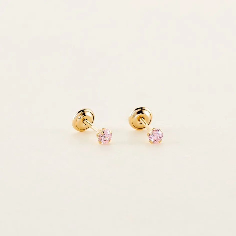 Boucles D’oreilles Puces Or Jaune 750/1000 Oxydes De Zirconium Roses Forme Ronde Serti 4 Griffes 3mm Fermoirs Vis