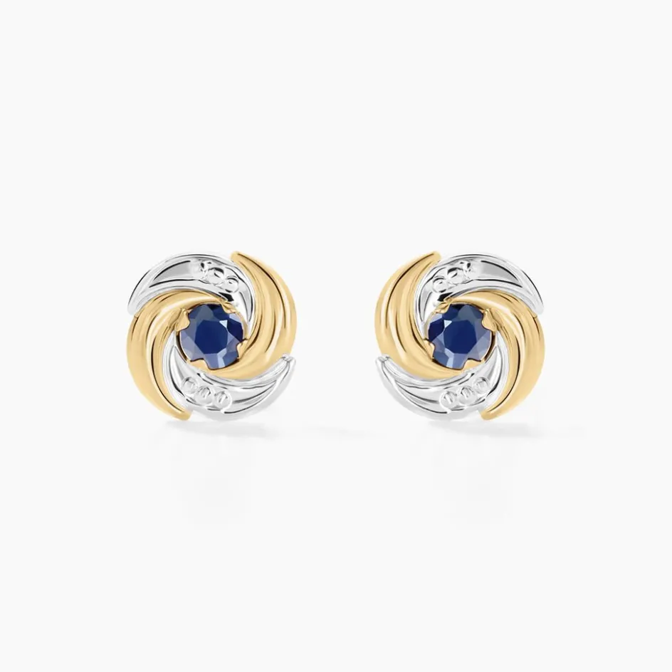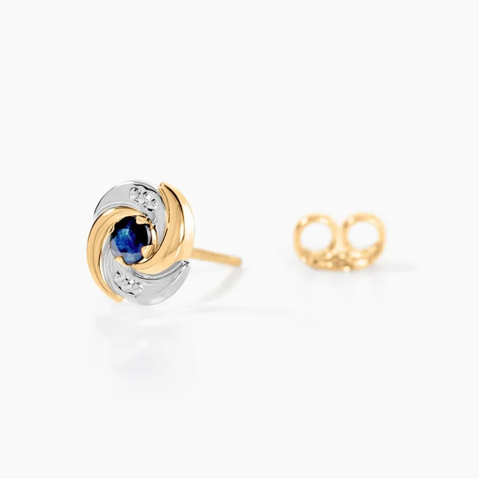 Boucles D’oreilles Puces Or Bicolore 375/1000 Fleurs Saphirs
