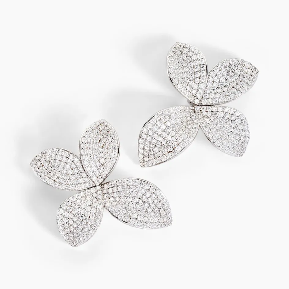 Boucles D’oreilles Puces Argent Blanc 925/1000 Fleurs Pavage Oxydes De Zirconium