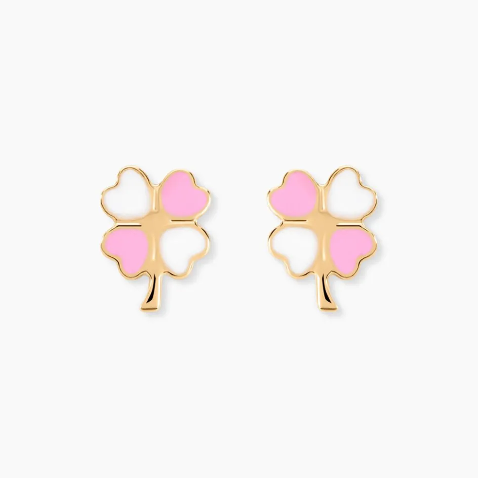 Boucles D’oreilles Or Jaune 375/1000 Trèfle Email Rose Et Blanc