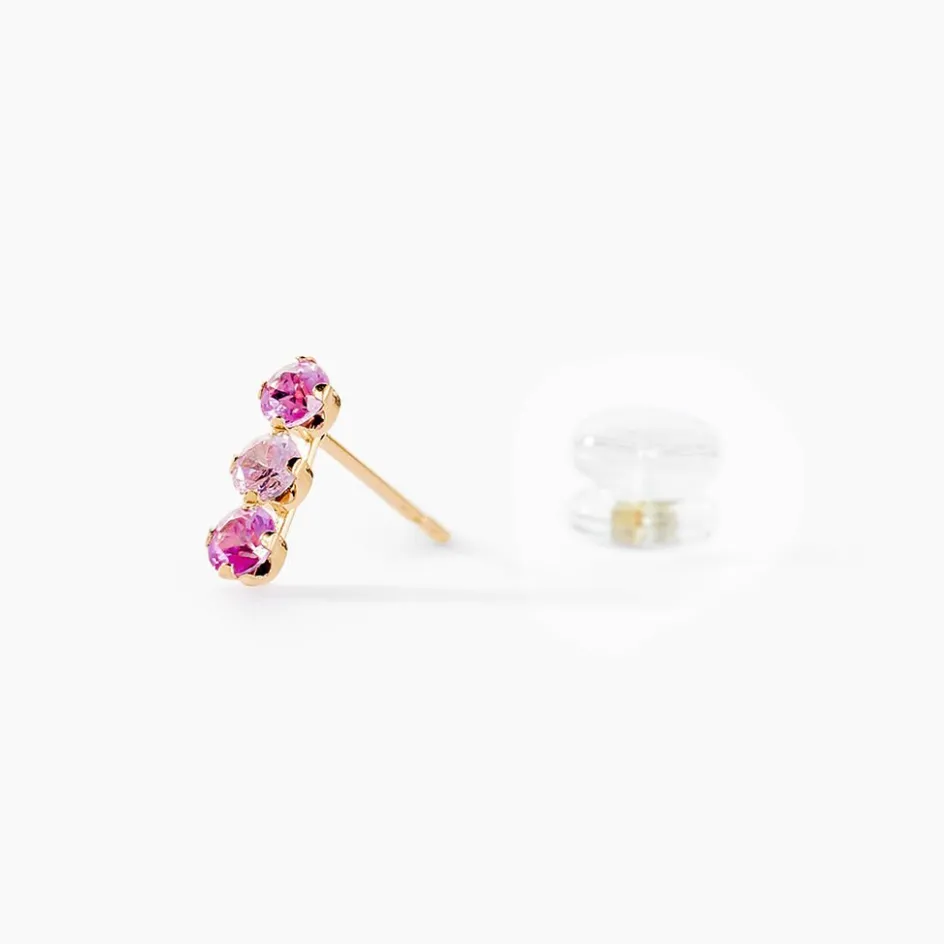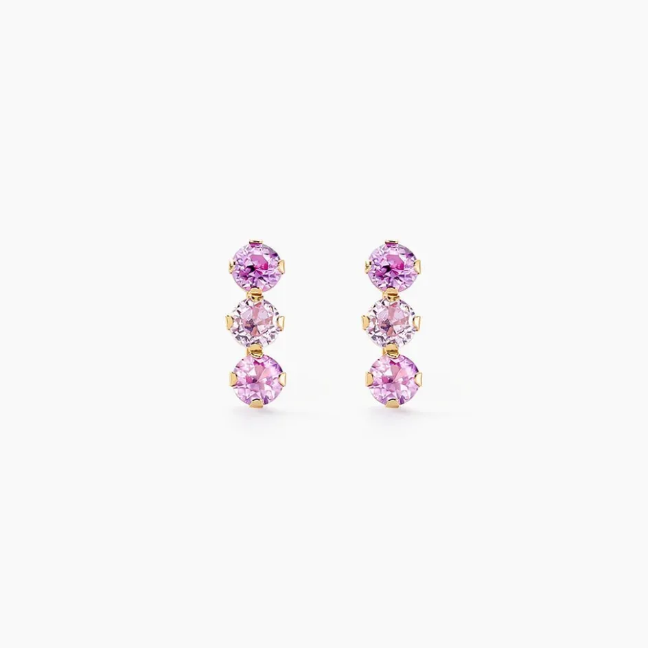 Boucles D’oreilles Puces Or Jaune 375/1000 Trilogie Oxydes De Zirconium Fuschia Et Rose Serti Griffes