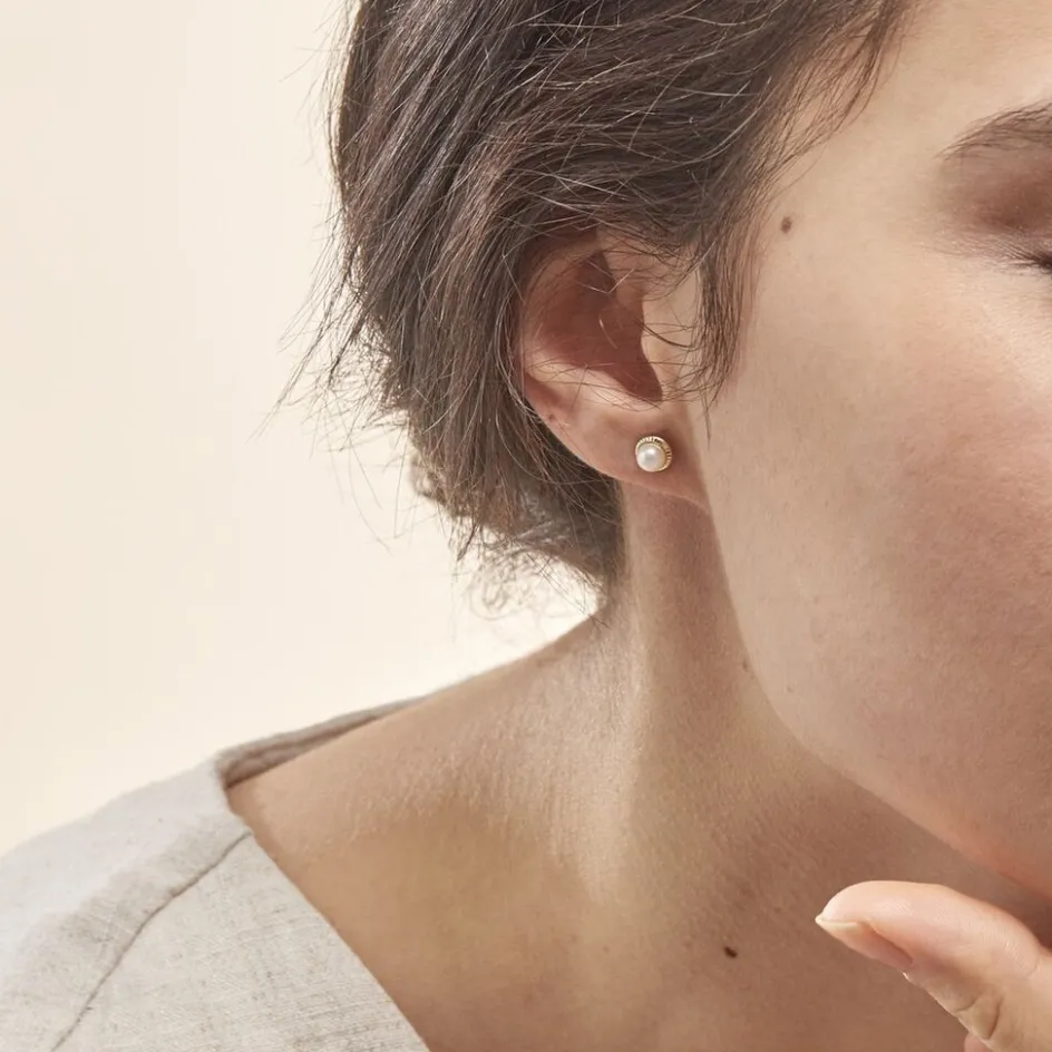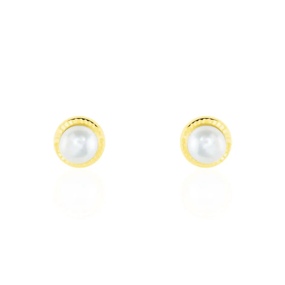 Boucles D’oreilles Or Jaune 375/1000 Puces Perles De Culture Contour Diamante