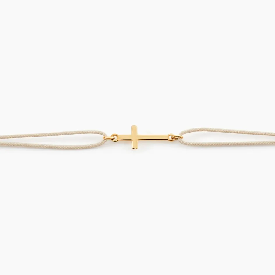 Bracelet Or Jaune 375/1000 Croix Sur Cordon Nylon Ajustable Beige