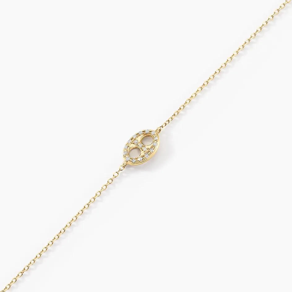 Bracelet Or Jaune 375/1000 Grain De Cafe Pavage Diamants Maille Forcat 16+2cm