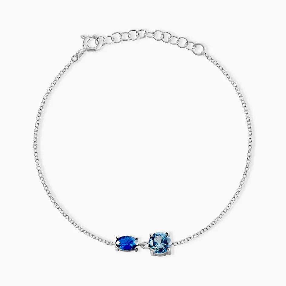 Bracelet Argent Blanc 925/1000 Serti Griffes Oxydes De Zirconium Bleu Clair Et Bleu Maille Forçat 19cm