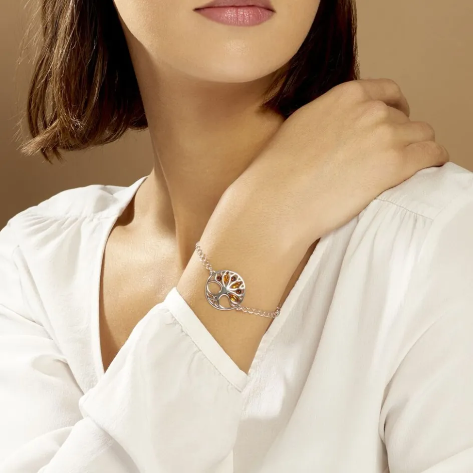 Bracelet Argent Blanc 925/1000 Arbre De Vie Ambre Cognac Et Marron 20cm