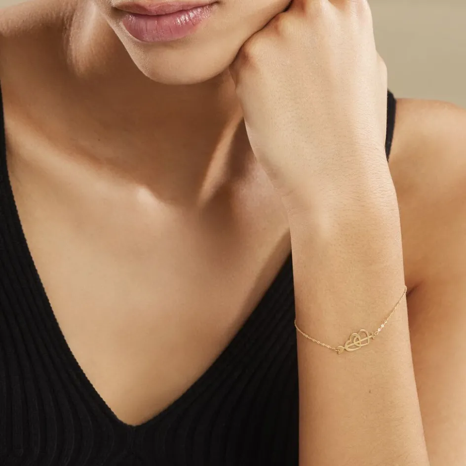 Bracelet Or Jaune 375/1000 Double C艙urs Ajoures Avec Fleche Maille Forcat 18cm