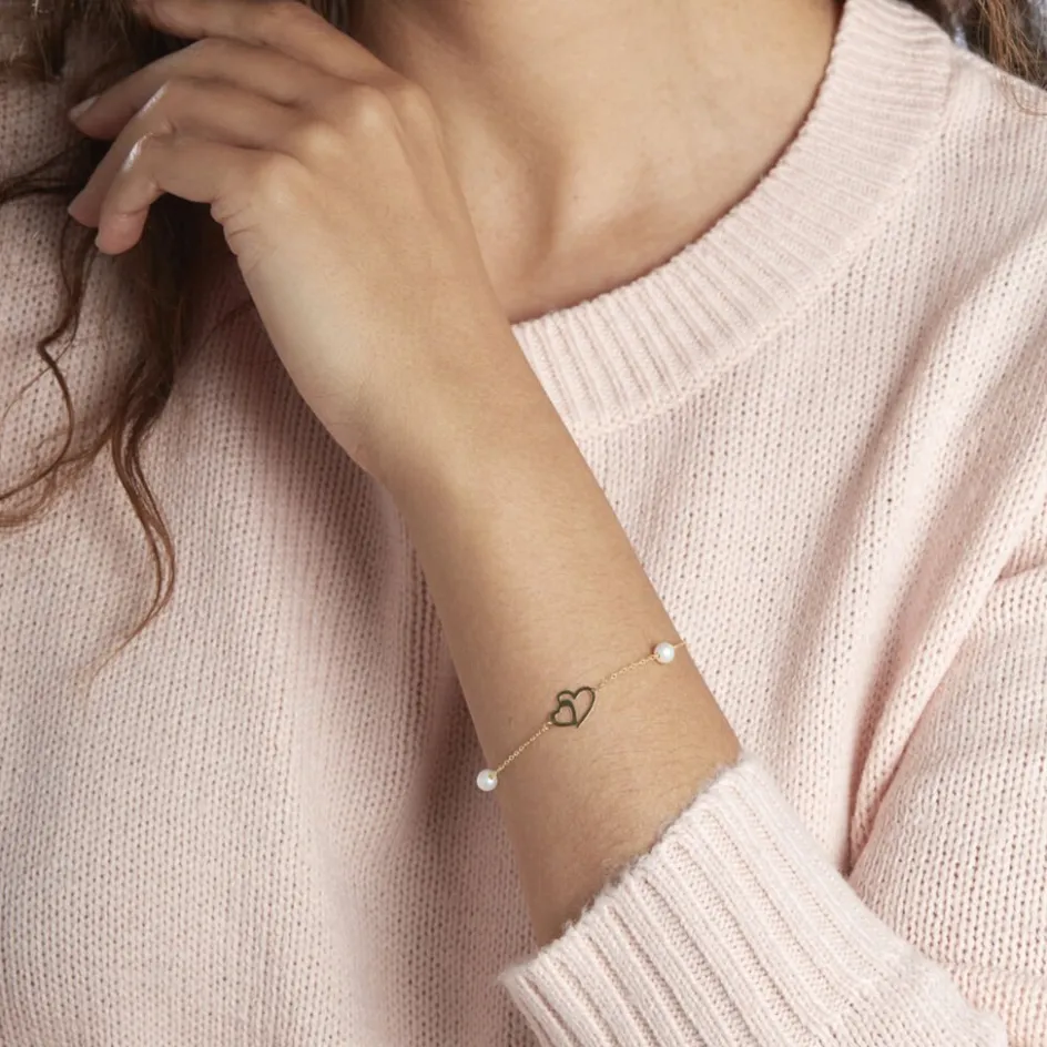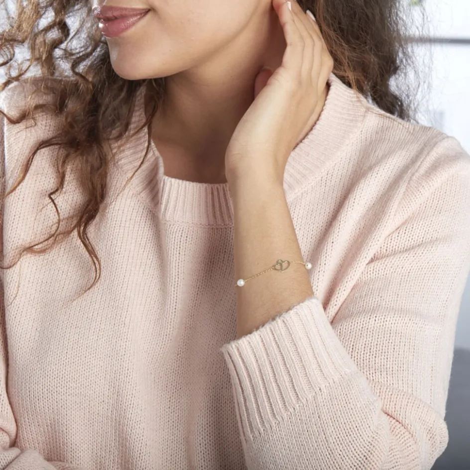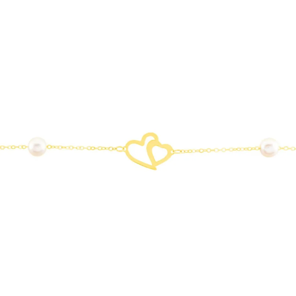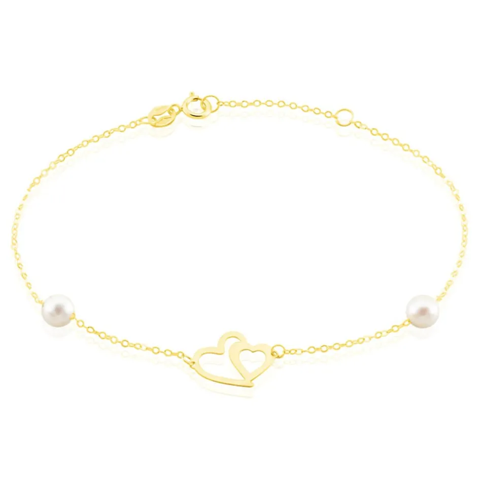 Bracelet Or Jaune 375/1000 Chaine Forçat Double C艙ur Perles De Culture 4.5/5mm 16+2cm