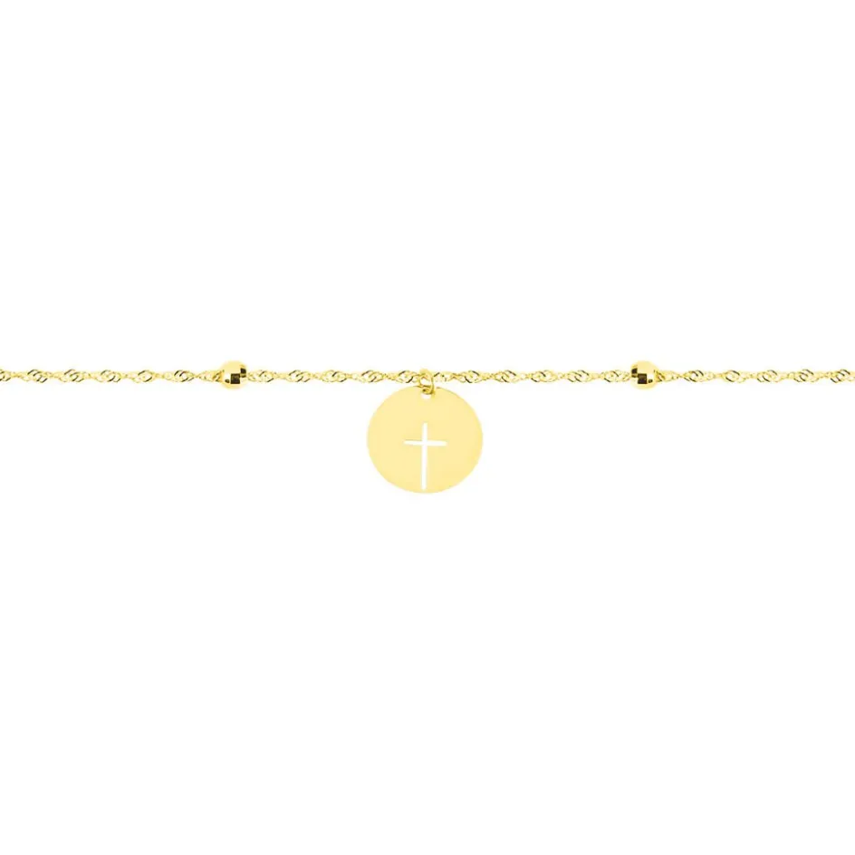 Bracelet Or Jaune 375/1000 Pastille Croix Ajourée Maille Forçat 18cm