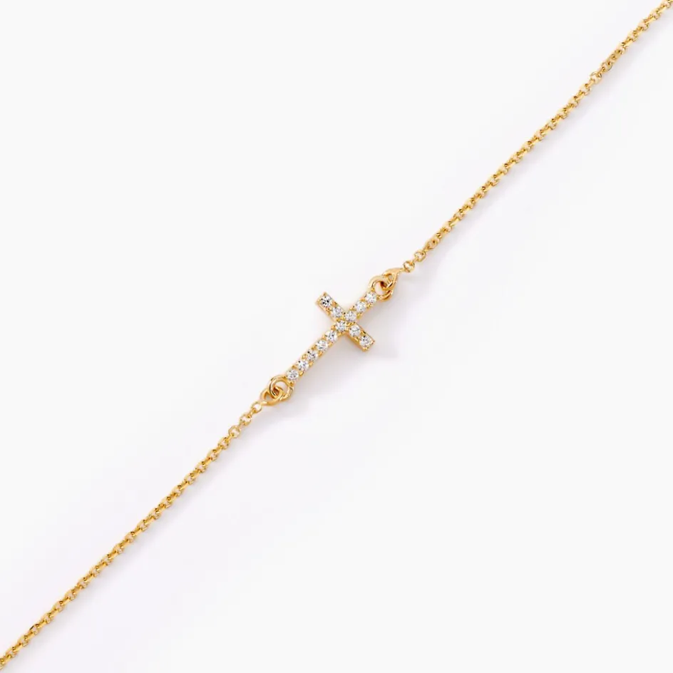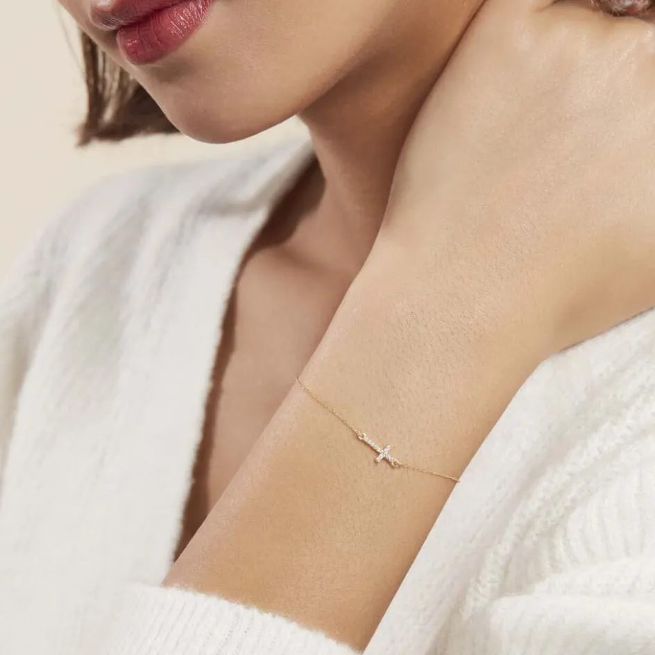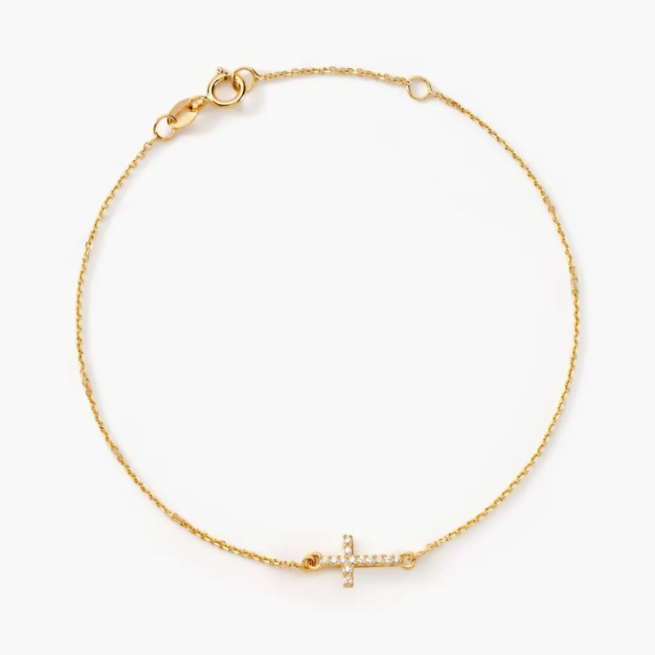 Bracelet Or Jaune 375/1000 Motif Croix Oxydes De Zirconium Maille Forçat 18cm