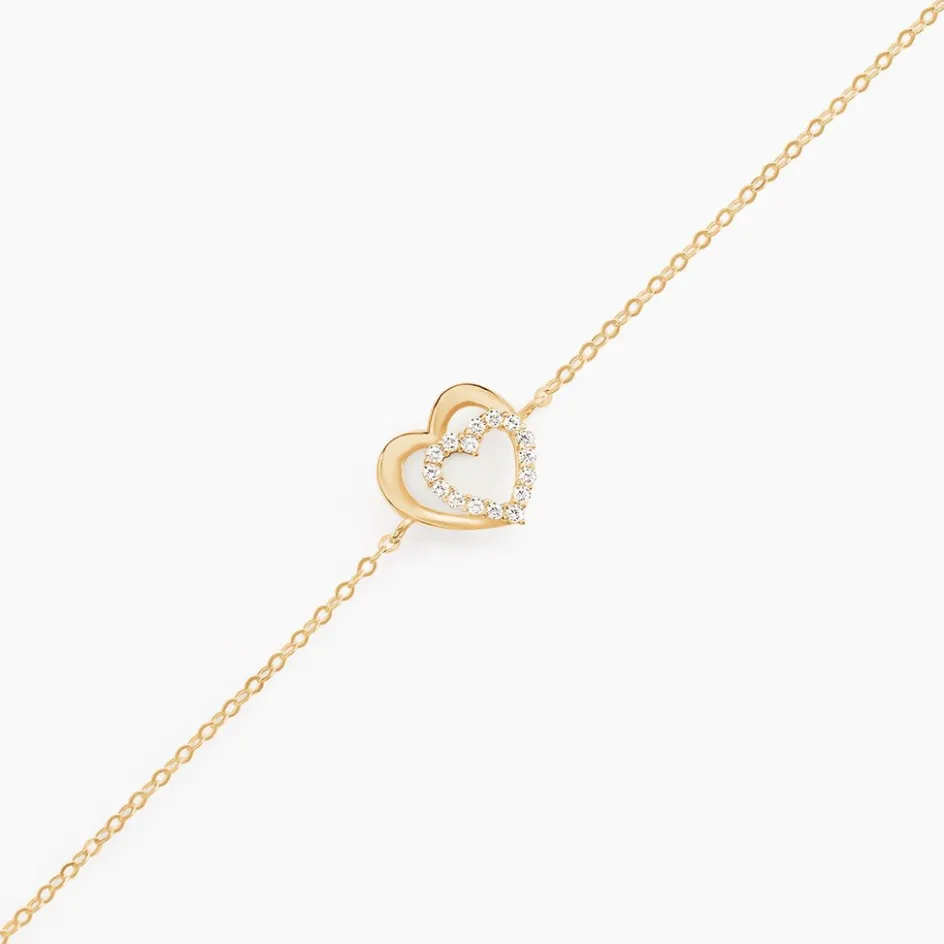 Bracelet Or Jaune 375/1000 Double C艙urs Pavage Oxydes De Zirconium 18cm