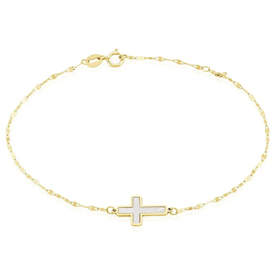 Bracelet Or Jaune 375/1000 Croix Nacre Blanche Maille Lumina 16+2cm