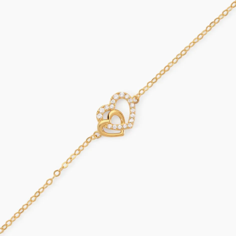 Bracelet Or Jaune 375/1000 Double C艙urs Ajoures Oxydes De Zirconium Sertis Griffes Maille Forcat 16+2cm