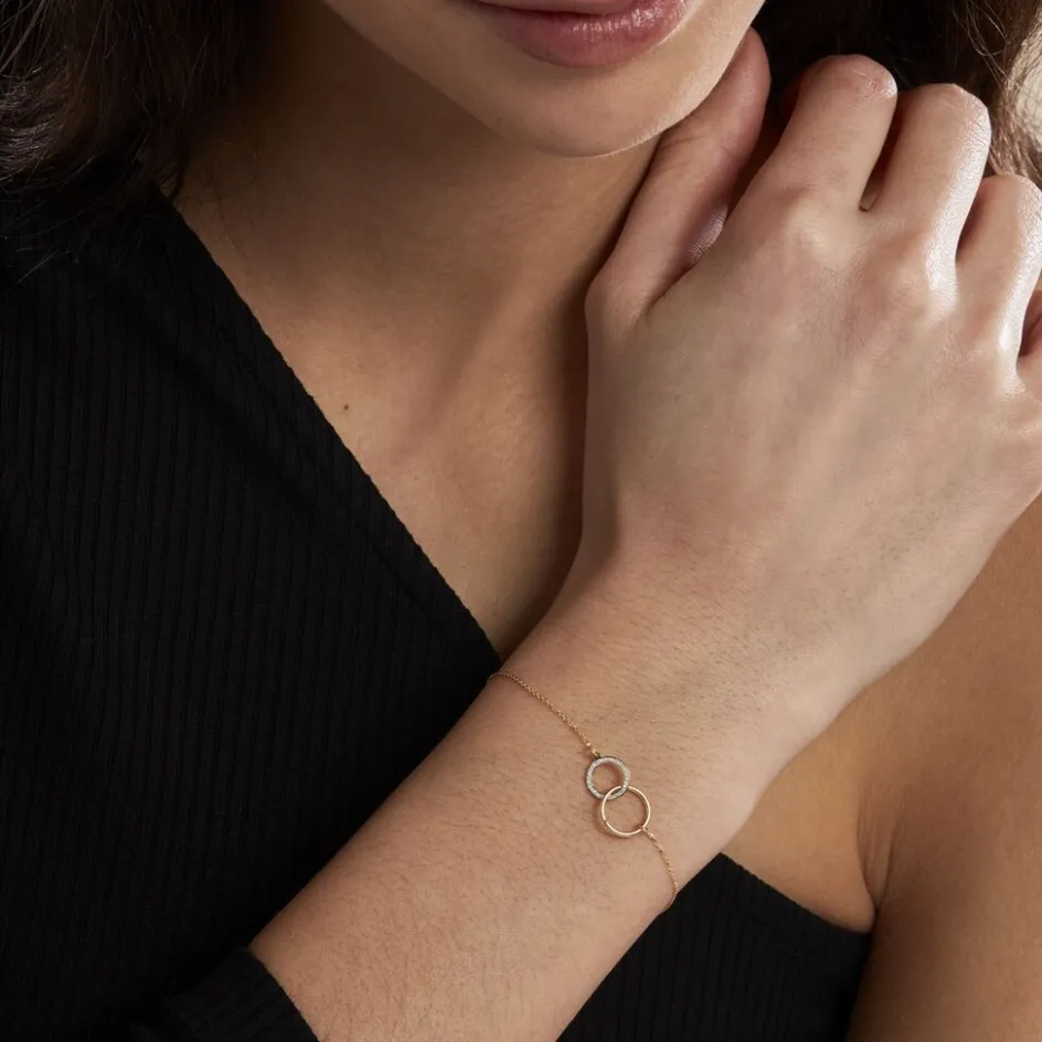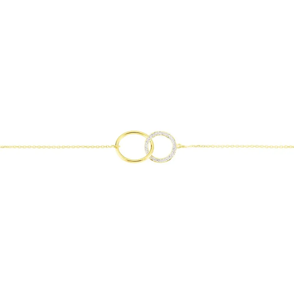Bracelet Or Jaune 375/1000 Double Cercles Dont Un Cercle Glitter Argente Maille Jaseron 16+2cm